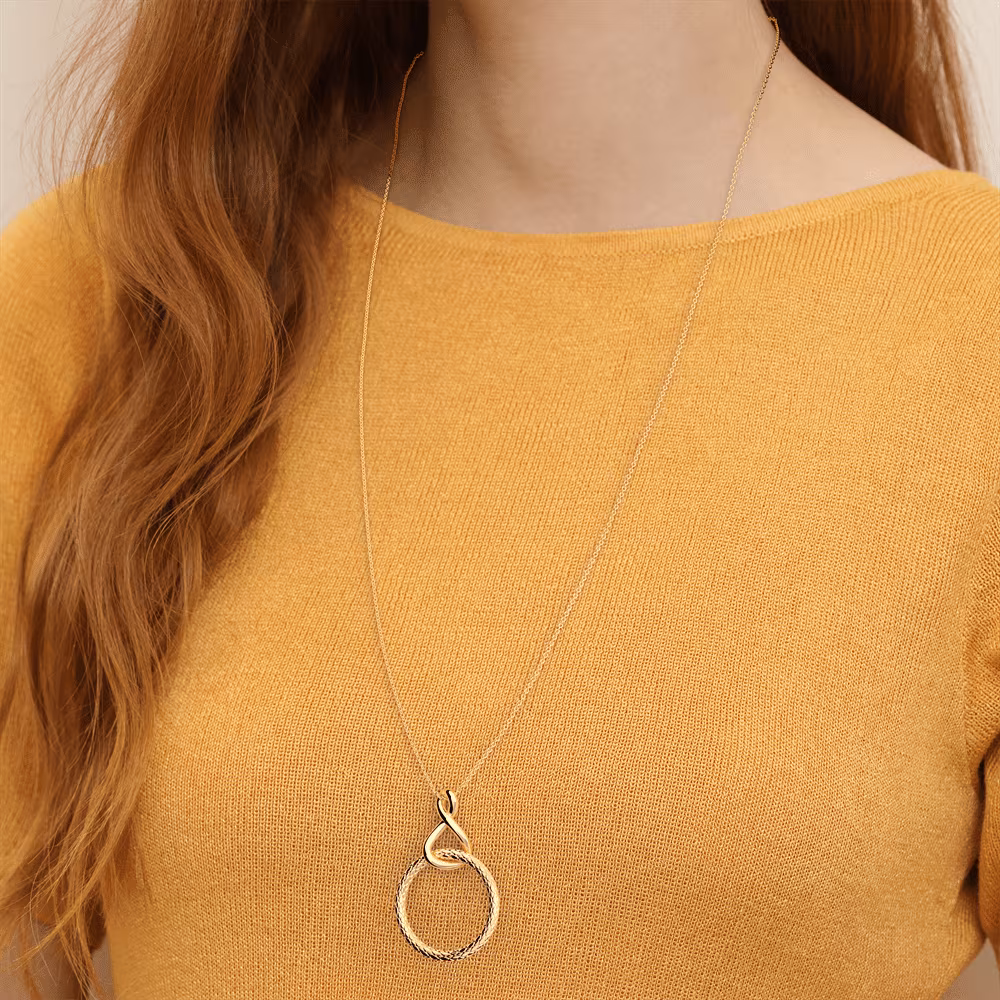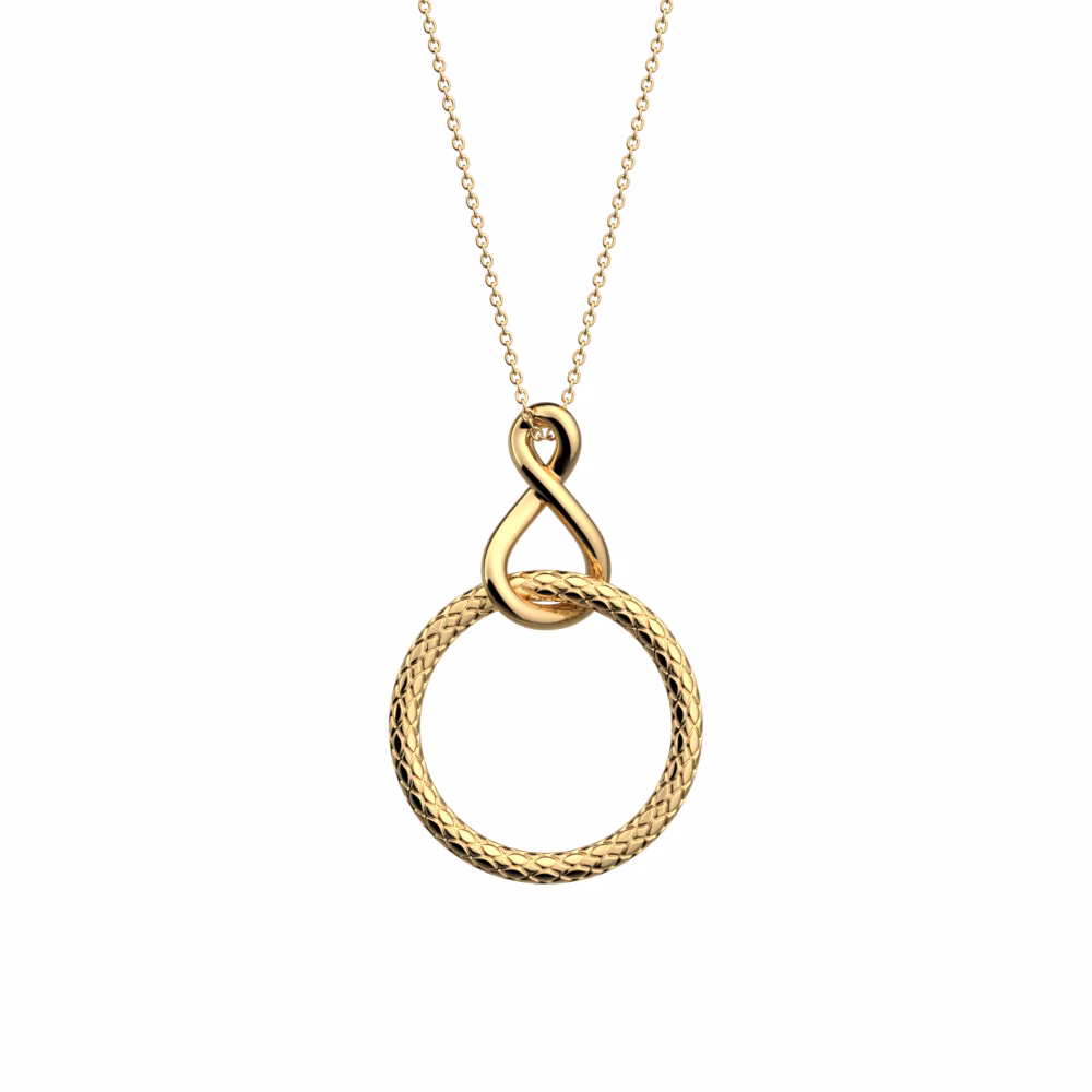 Le sautoir Les Georgettes Icône Infini sublime votre style avec son pendentif au design moderne et intemporel. Réalisé en laiton doré, il présente un motif infini qui maintient délicatement un cercle orné d’une finition gravure reptile. Ce jeu de formes et de textures crée un contraste raffiné, entre fluidité et caractère.