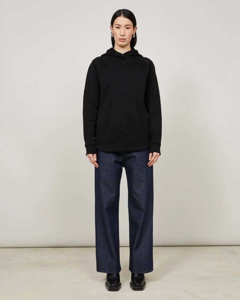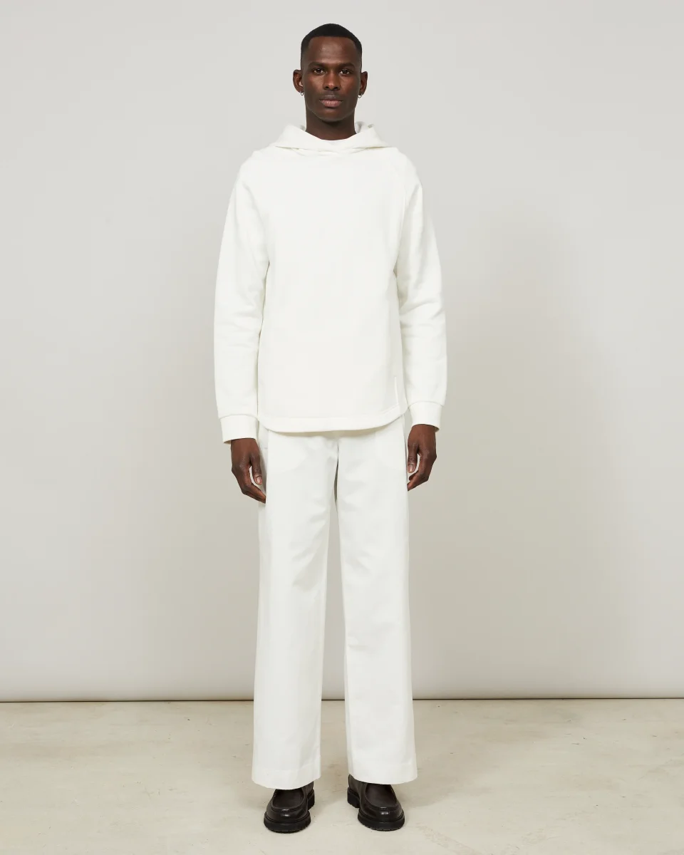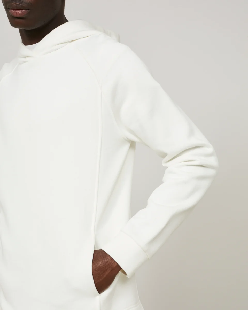 Ce sweat-shirt est un modèle unisexe réalisé dans un molleton de coton supima de poids moyen, à la main compacte et très douce. Ce sweat-shirt présente une coupe droite classique, avec une capuche et des poches discrètes, prises dans les coutures côtés, et un ourlet liquette surpiqué, signature de la marque.