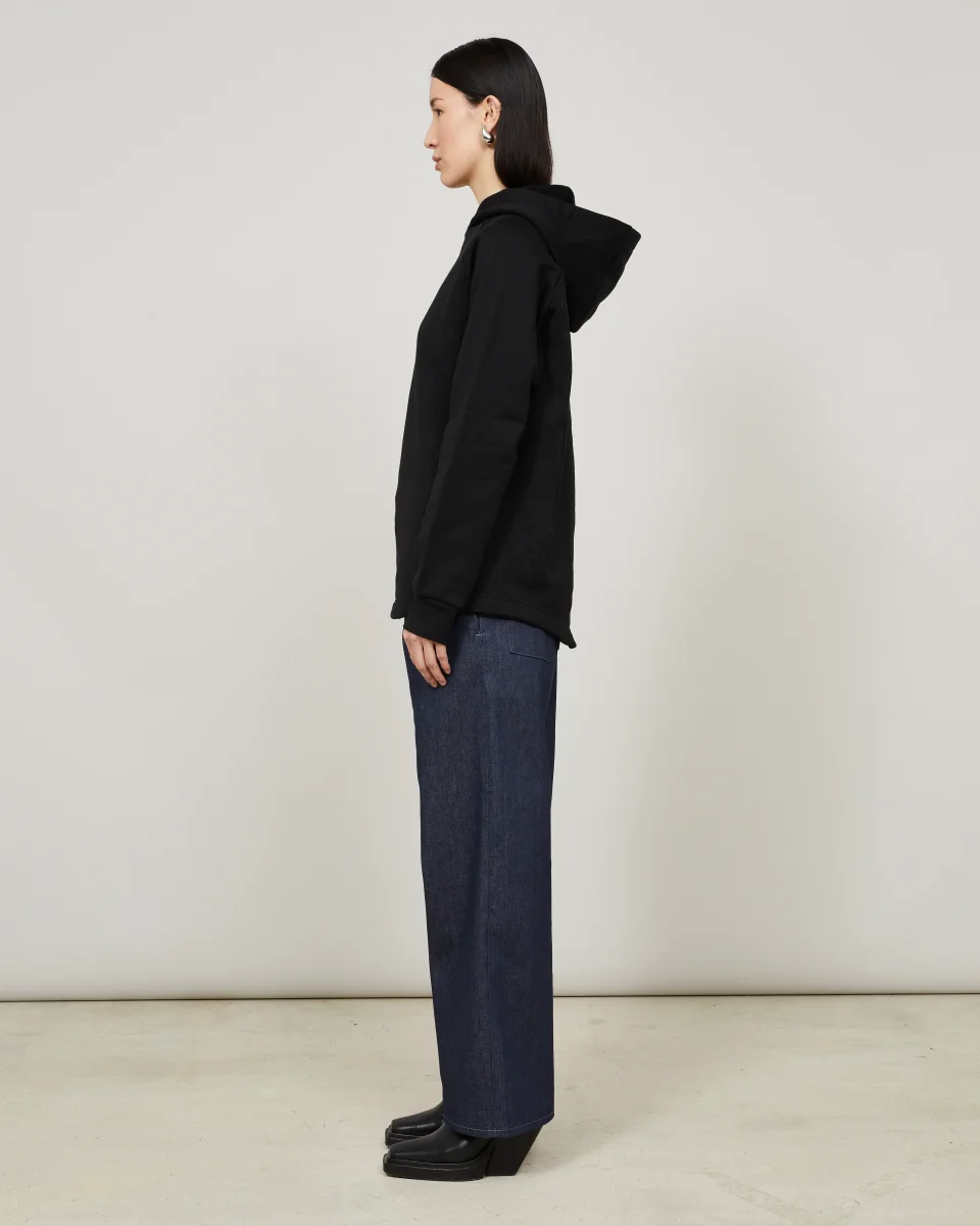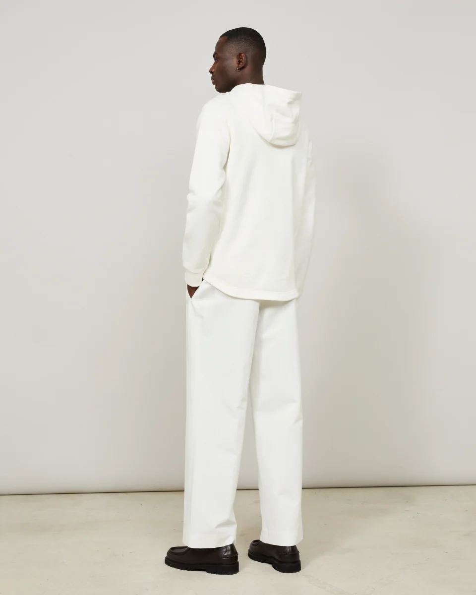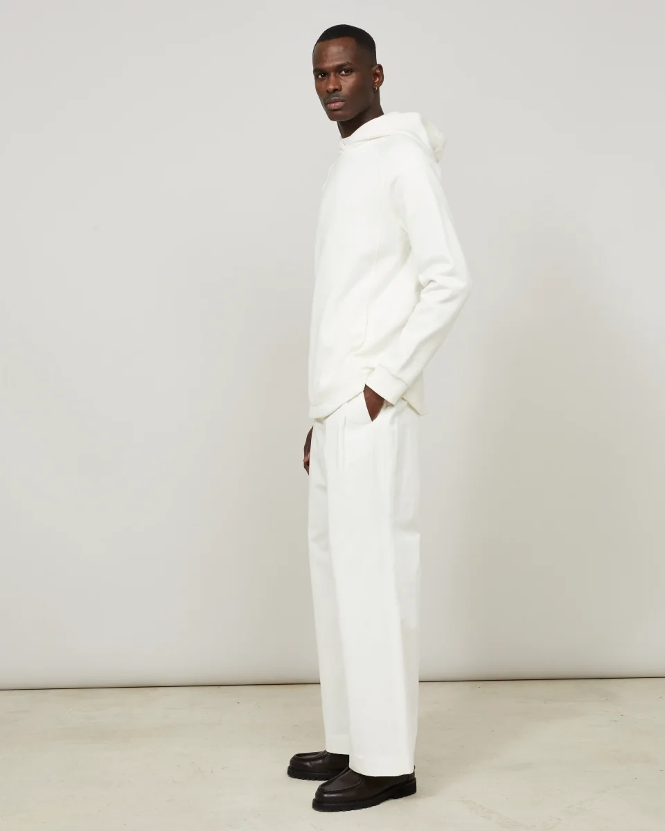 Ce sweat-shirt est un modèle unisexe réalisé dans un molleton de coton supima de poids moyen, à la main compacte et très douce. Ce sweat-shirt présente une coupe droite classique, avec une capuche et des poches discrètes, prises dans les coutures côtés, et un ourlet liquette surpiqué, signature de la marque.