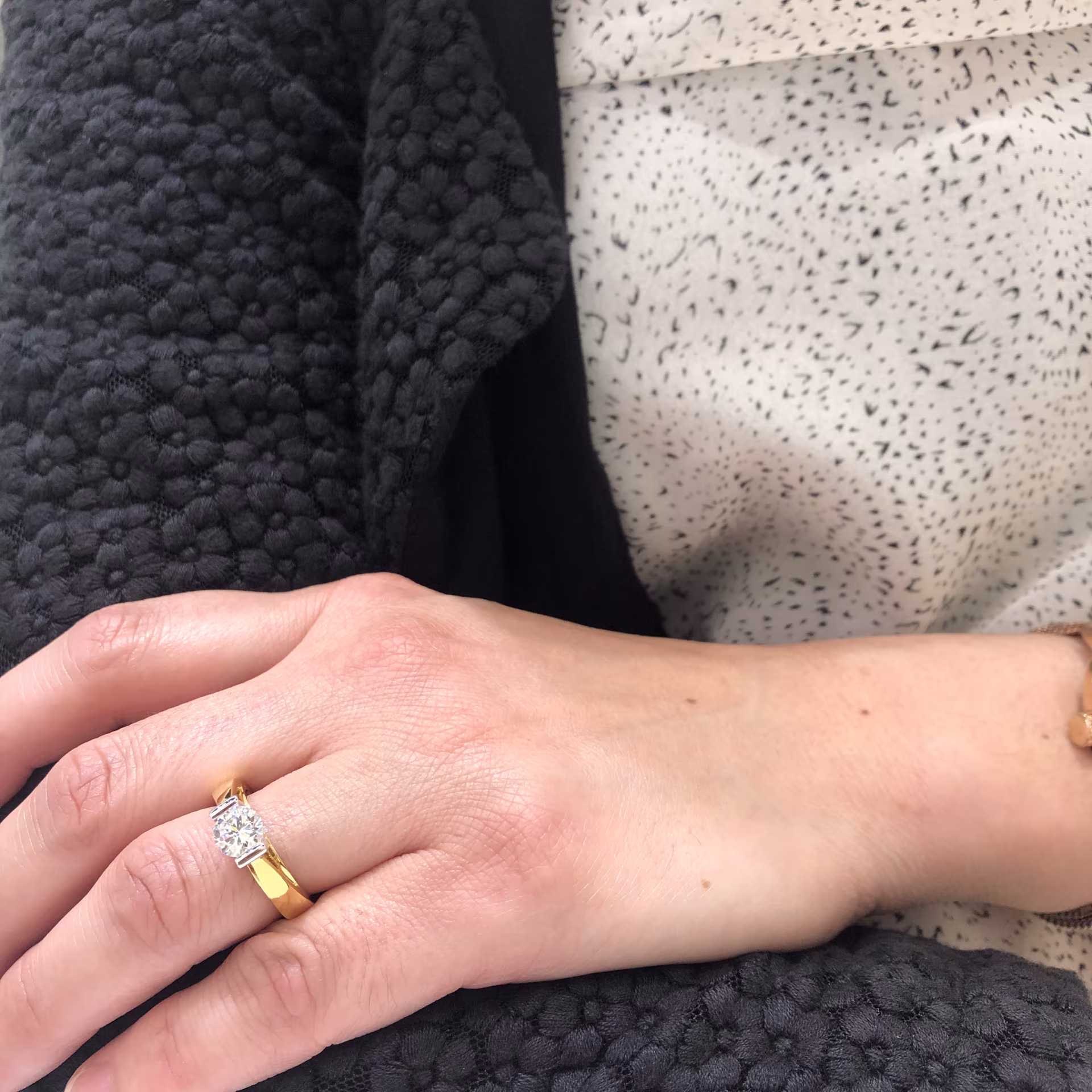 Affirmez l’intensité de vos moments uniques avec cette somptueuse bague solitaire en or jaune et blanc 18 carats. Au cœur de cette pièce, un diamant de laboratoire de 1.00 carat, certifié F-VS minimum, incarne l’éclat ultime et l’élégance absolue.