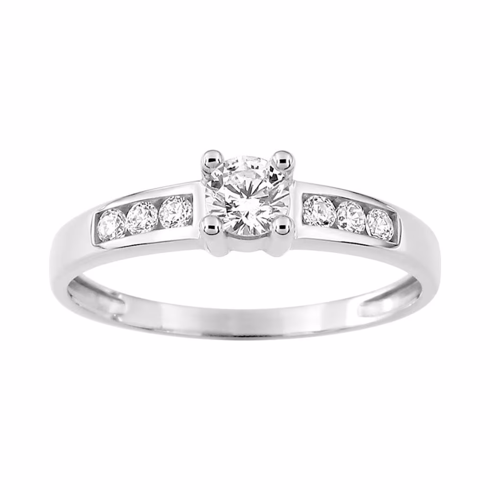 Ce solitaire accompagné en or blanc 375/1000 séduit par sa ligne classique et raffinée. En son centre, un oxyde de zirconium taille ronde de 4mm, monté sur quatre griffes, capte la lumière avec intensité. De part et d’autre, six oxydes sertis clos viennent sublimer l’éclat du bijou tout en créant un bel effet de perspective. Sa monture lisse et légèrement galbée en fait une bague facile à porter au quotidien comme pour une occasion spéciale.