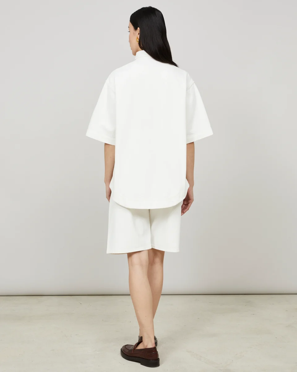 Cette surchemise, à la coupe oversize, est confectionnée dans une toile de denim 100% coton, tissée en Italie, à la main dense et souple à la fois. Elle reprend les codes du workwear avec sa silhouette carrée et sa poche poitrine plaquée. Un ourlet liquette surpiqué et des boutons miroir argentés, deux signatures de la […]