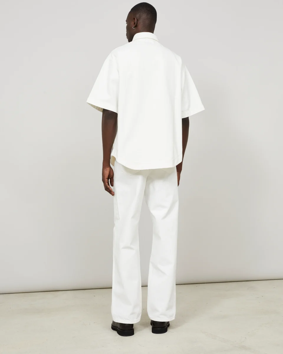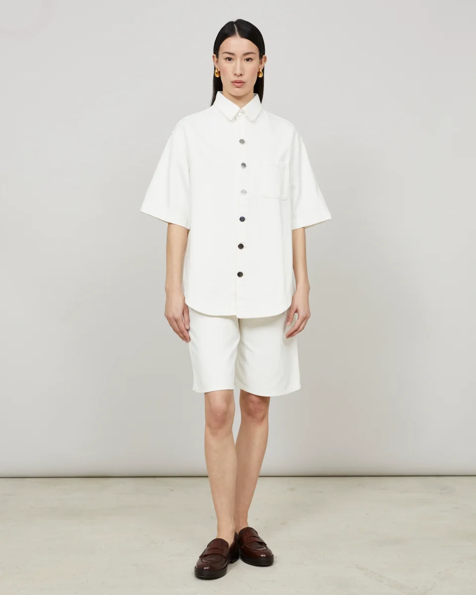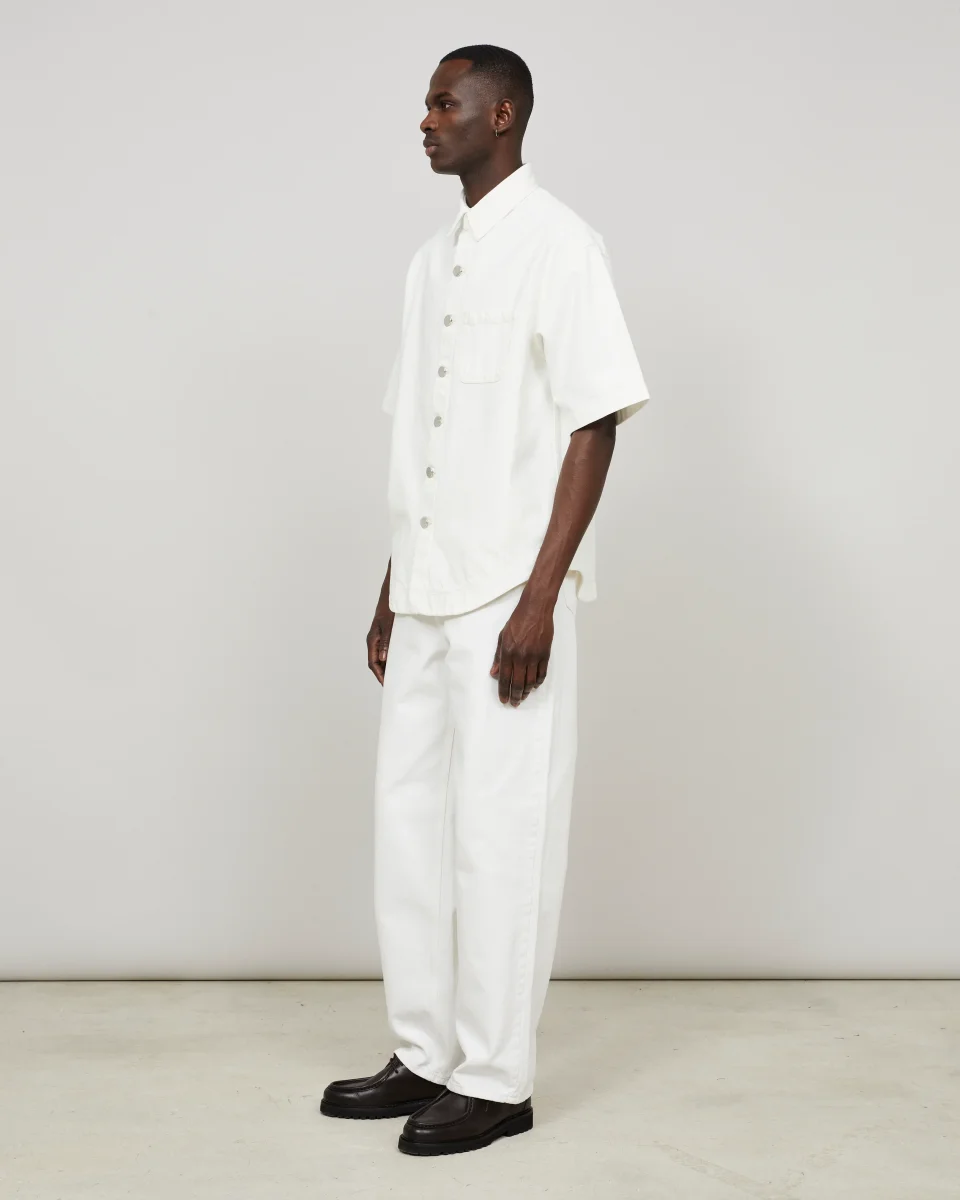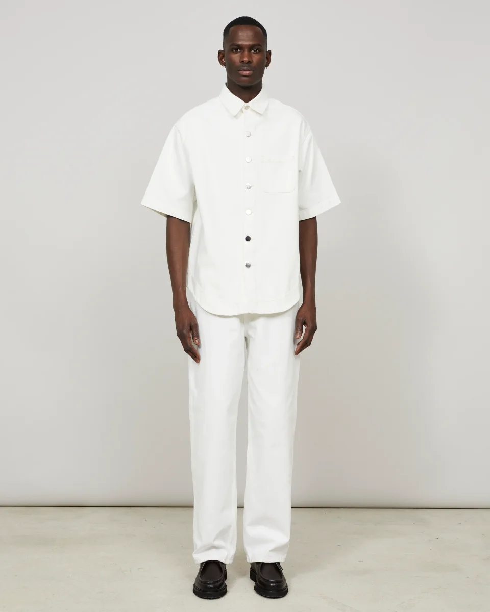 Cette surchemise, à la coupe oversize, est confectionnée dans une toile de denim 100% coton, tissée en Italie, à la main dense et souple à la fois. Elle reprend les codes du workwear avec sa silhouette carrée et sa poche poitrine plaquée. Un ourlet liquette surpiqué et des boutons miroir argentés, deux signatures de la marque, complètent les finitions de cette pièce.