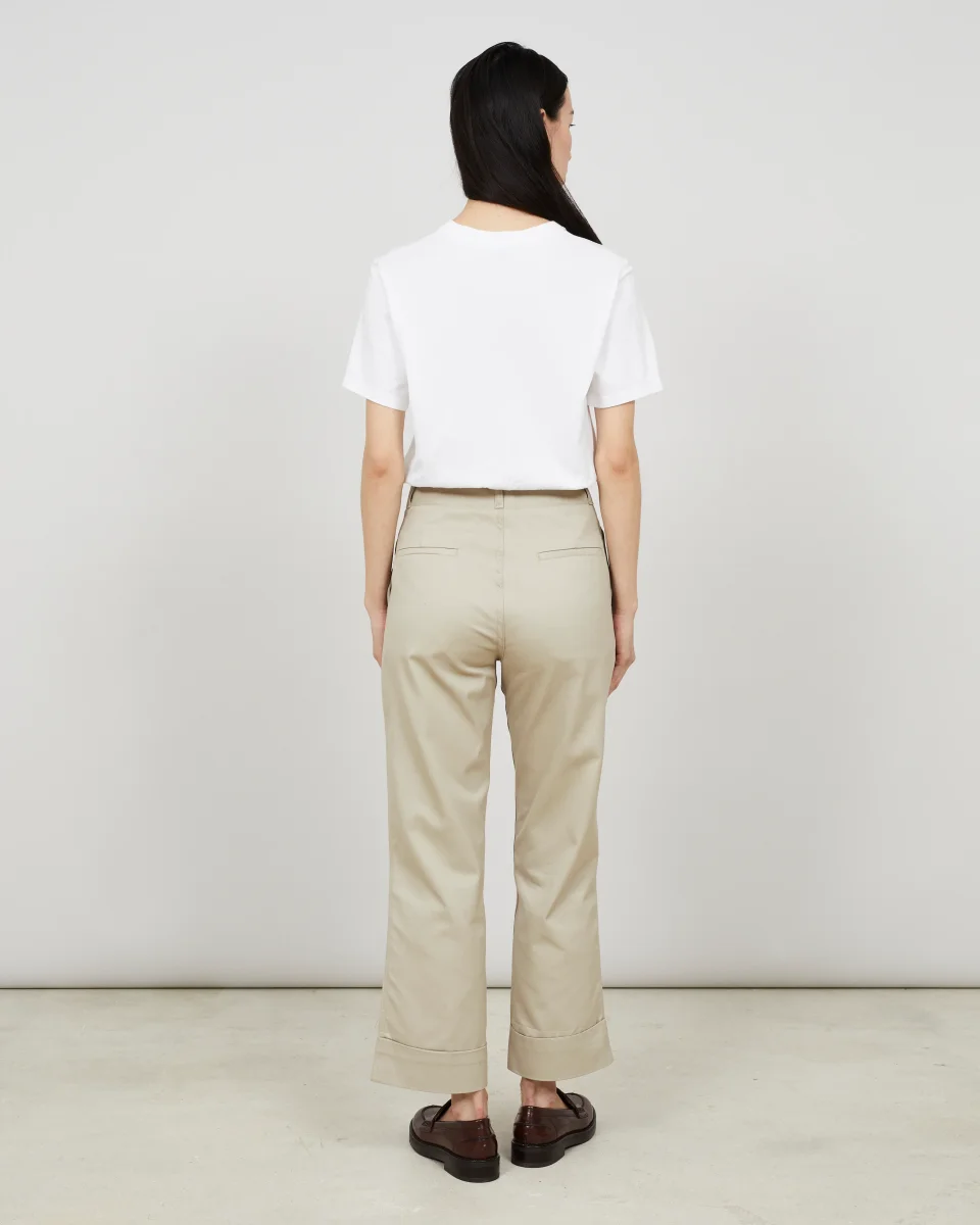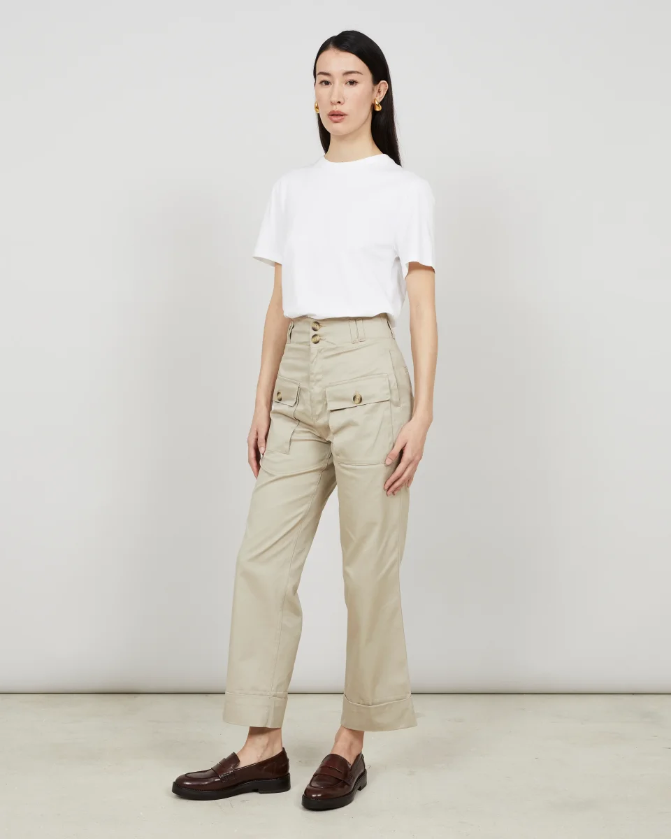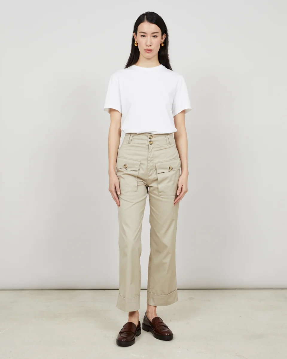 Ce pantalon, à la taille haute, est réalisé dans une gabardine de coton, tissé au Royaume-Uni, à la main douce et au tombé fluide. Sa coupe droite est soulignée par deux grandes poches à rabat plaquées sur le devant. Deux poches côtés, des poches passepoilées sur le dos et un ourlet à revers complètent les finitions de ce pantalon.
