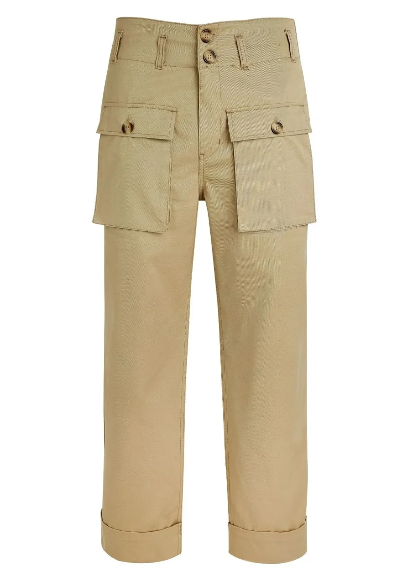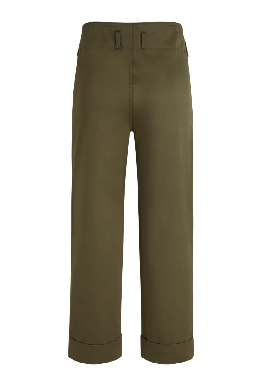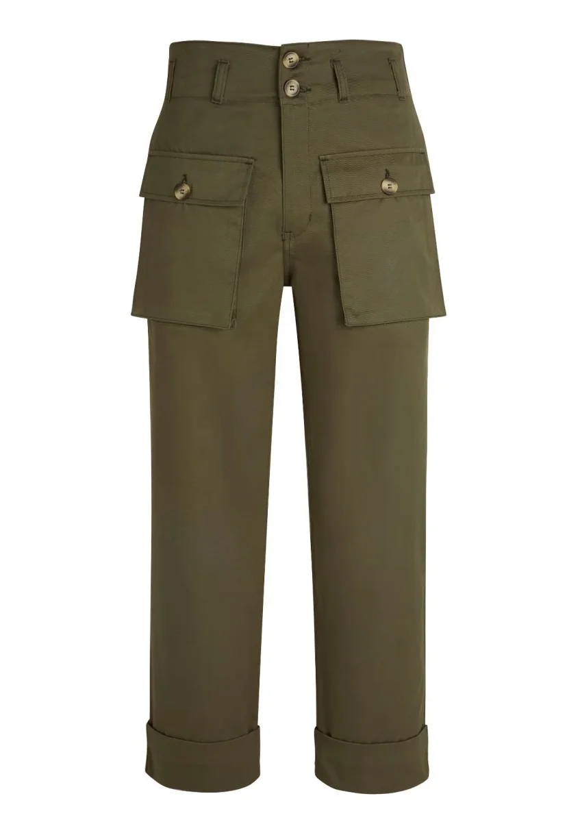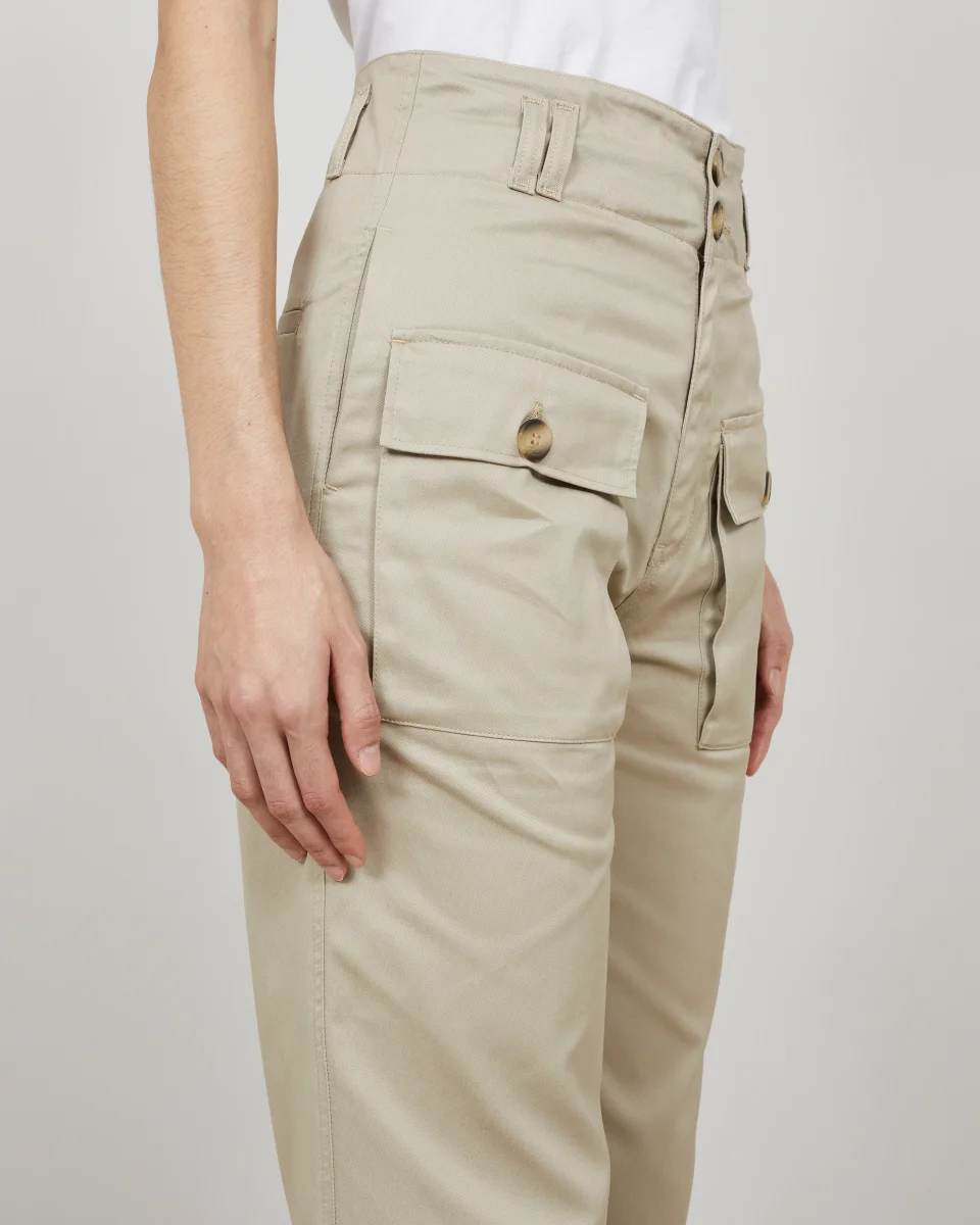 Ce pantalon, à la taille haute, est réalisé dans une gabardine de coton, tissé au Royaume-Uni, à la main douce et au tombé fluide. Sa coupe droite est soulignée par deux grandes poches à rabat plaquées sur le devant. Deux poches côtés, des poches passepoilées sur le dos et un ourlet à revers complètent les finitions de ce pantalon.