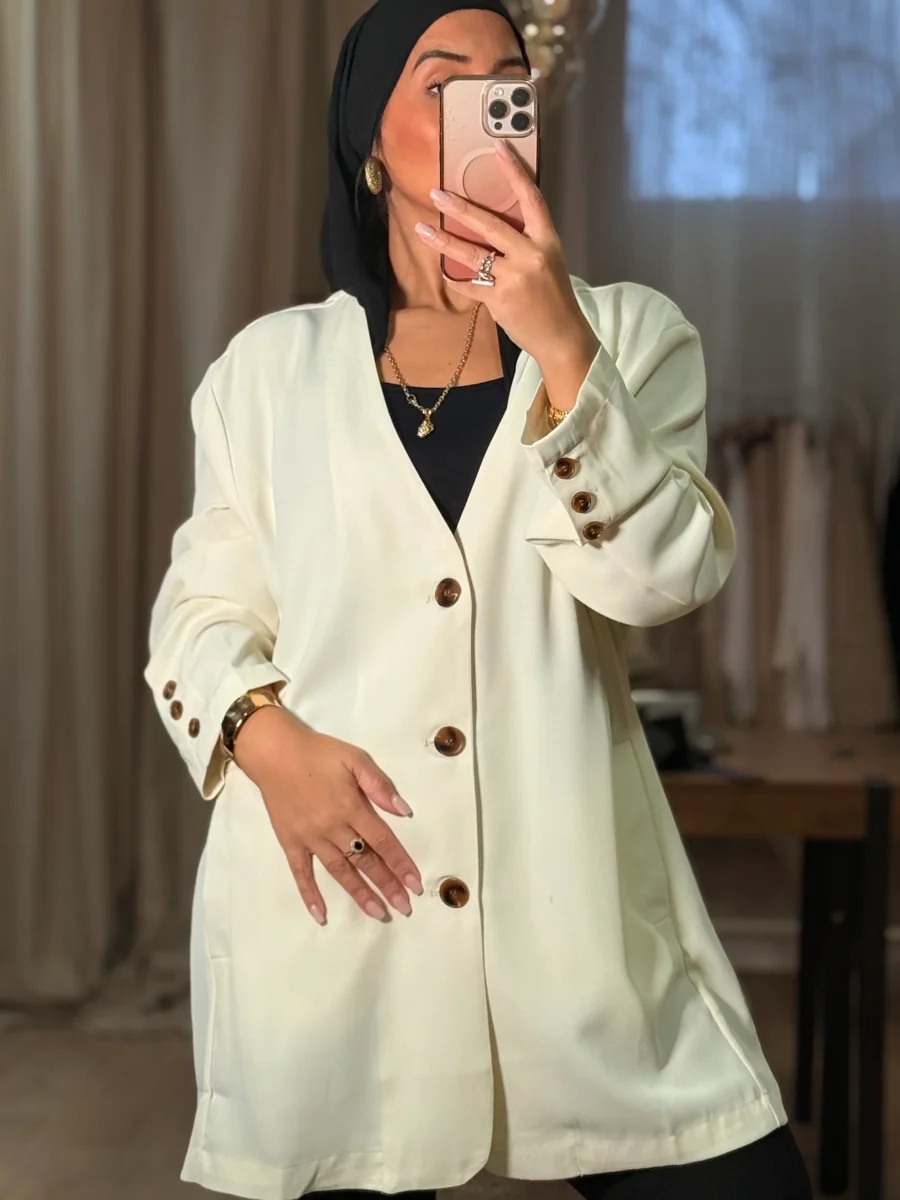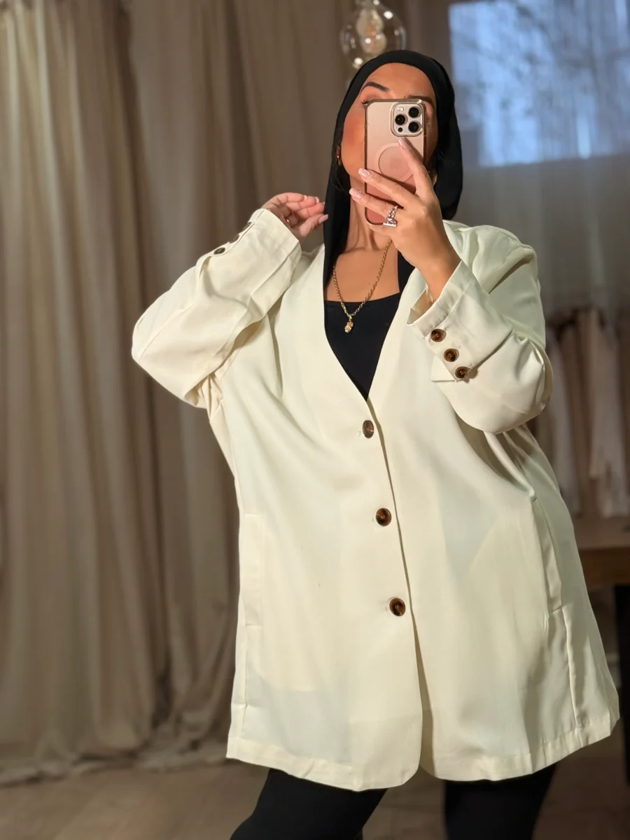 Cette veste blazer Dina écru est une pièce d’élégance à la mode. Avec son style oversize, elle peut être portée comme un blazer ou comme une robe pour différentes occasions. Cette veste est un indispensable pour un look unique et élégant.
